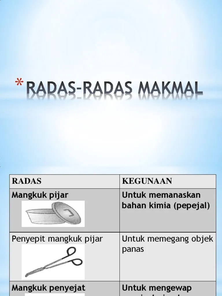 Gabus · kelalang dasar bulat. Digunakan untuk menyumbat tabung uji atau kelalang kon. Mengisi bahan kimia atau mengumpul cecair. Bikar · pemegang tabung uji. Contextual translation of kelalang kon dasar bulat into english. Latihan 1 sains tahun 4 · 1. Contextual translation of kelalang dasar bulat into english. Namakan alat radas di bawah dengan betul.